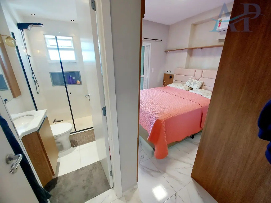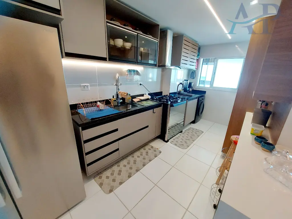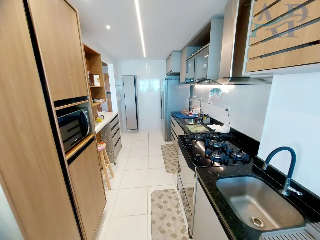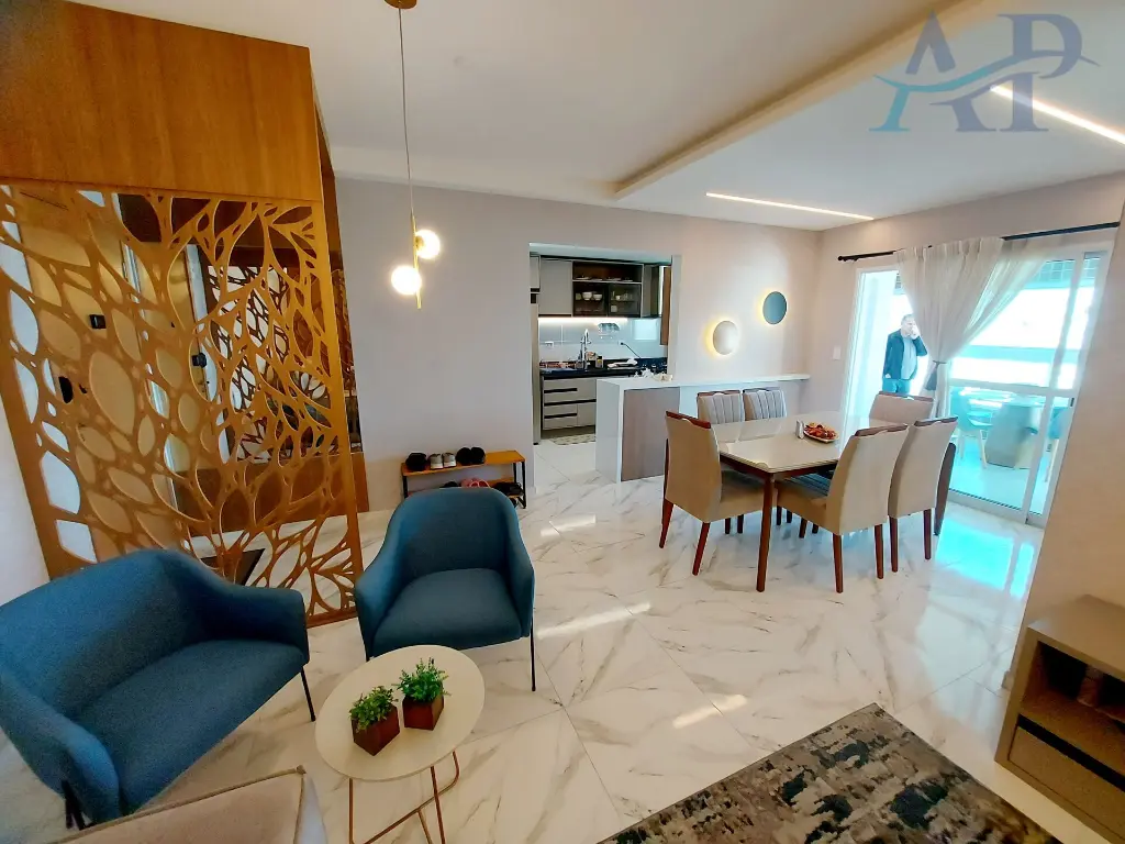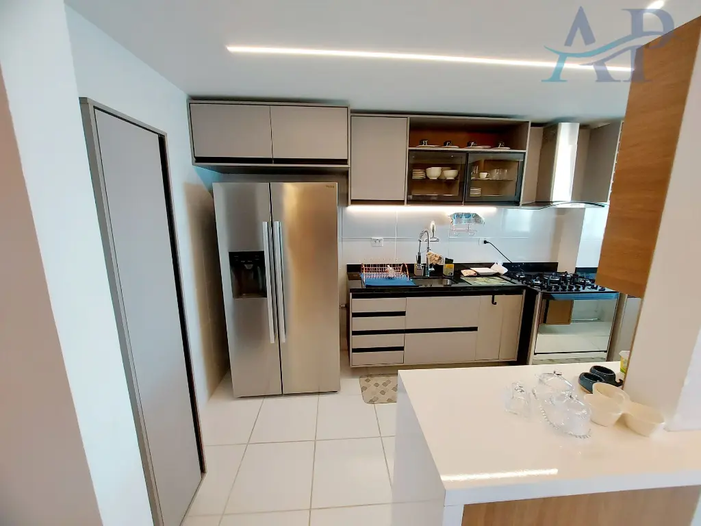 Com 3 dormito´rios, sendo 3 sui´tes, cozinha ampla e integrada com a a´rea de servic¸o e sala, lavabo, sala para dois ambientes, varanda Gourmet com vista frontal para o mar e duas vagas de garagem.