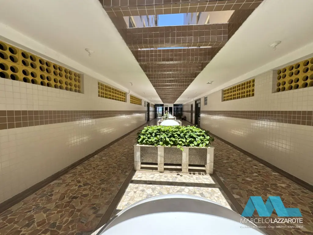 Apartamento com vista para o mar de 53 m² de área útil com 1 quarto, sala grande para 2 ambientes, cozinha grande, banheiro, área de serviço e 1 vaga de garagem coletiva do condomínio.