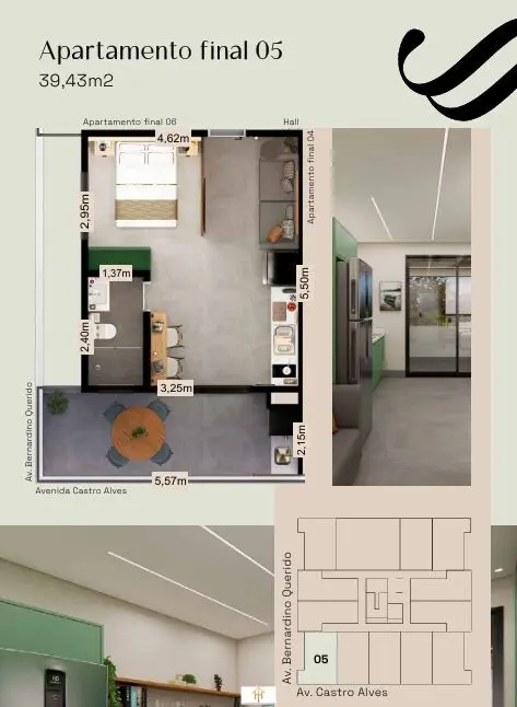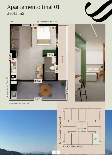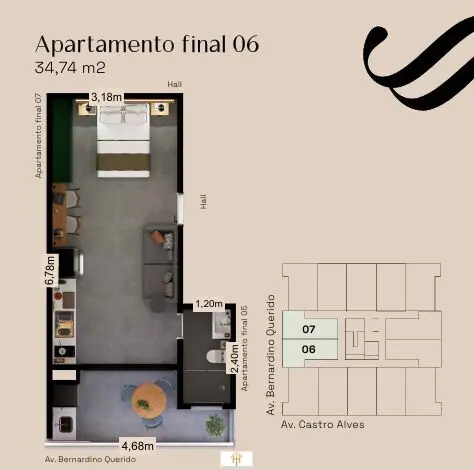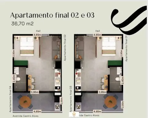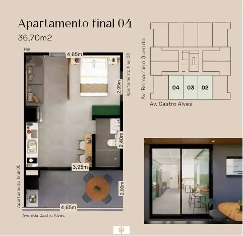 34,74 m²36,70 m²39,43 m²Unidades selecionadas permitem unificação de studios, formando apartamentos de até 2 dormitórios (conforme disponibilidade), além de vagas para carros grandes em unidades predeterminadas.