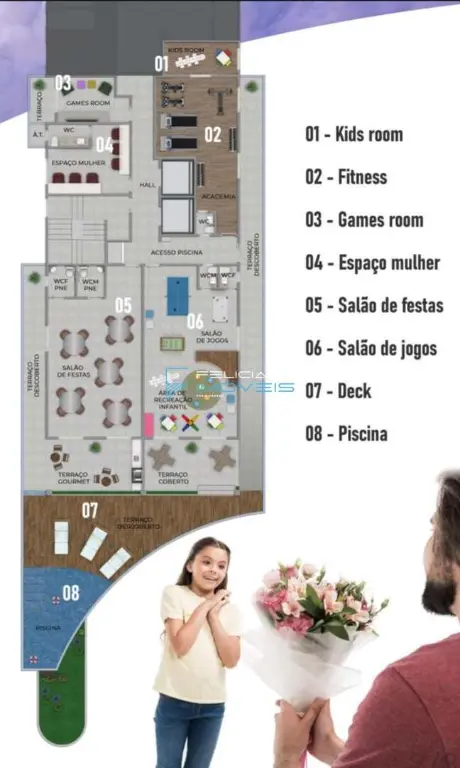 Salão de festas, salão de jogos, piscina com deck, academia.