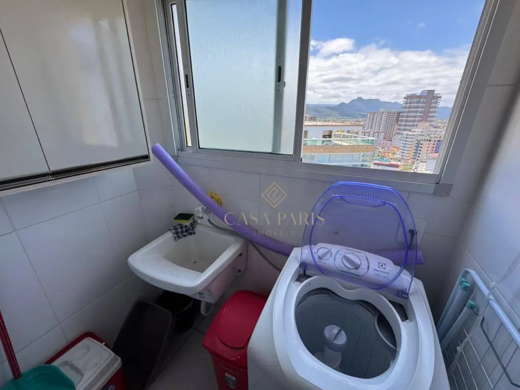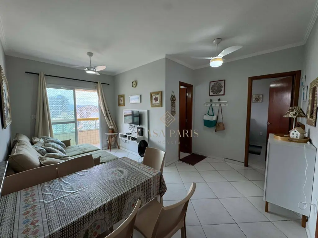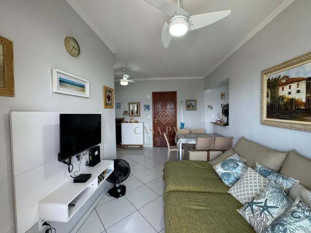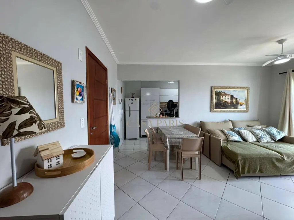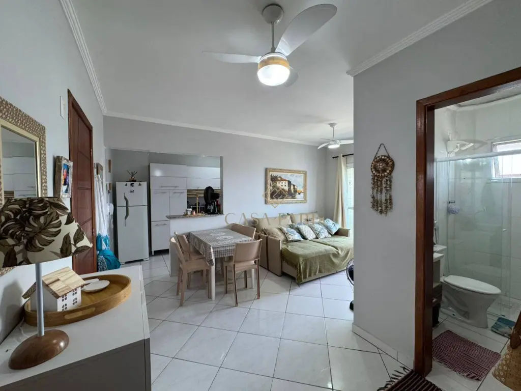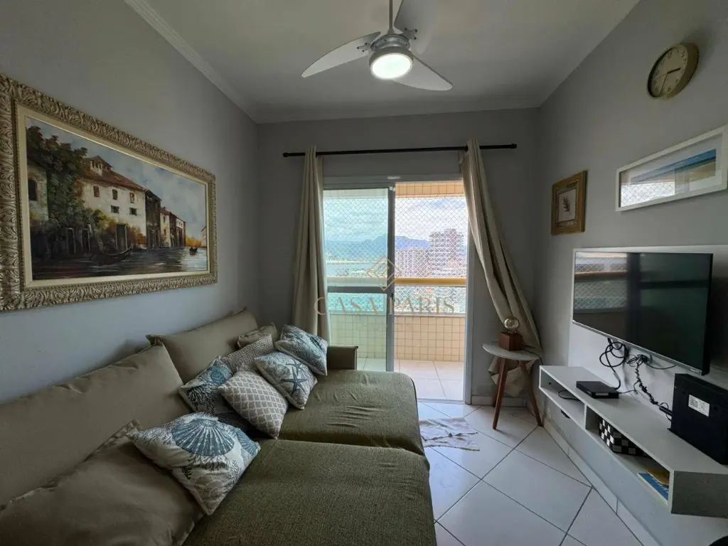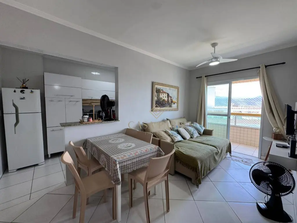 Apartamento com 1 dormitório, sala para dois ambientes, varanda com vista mar, cozinha, banheiro, área de serviço e 1 vaga de garagem.