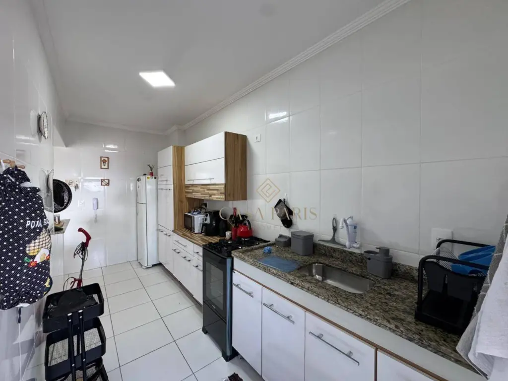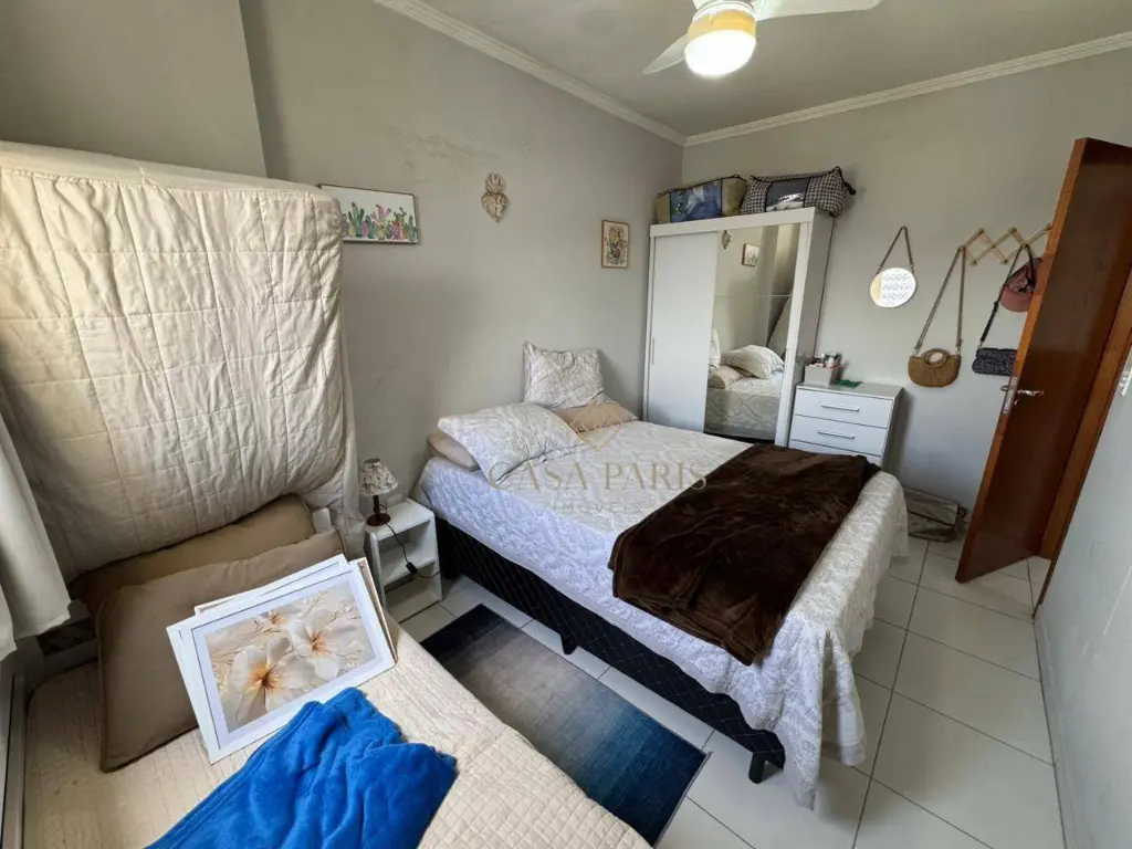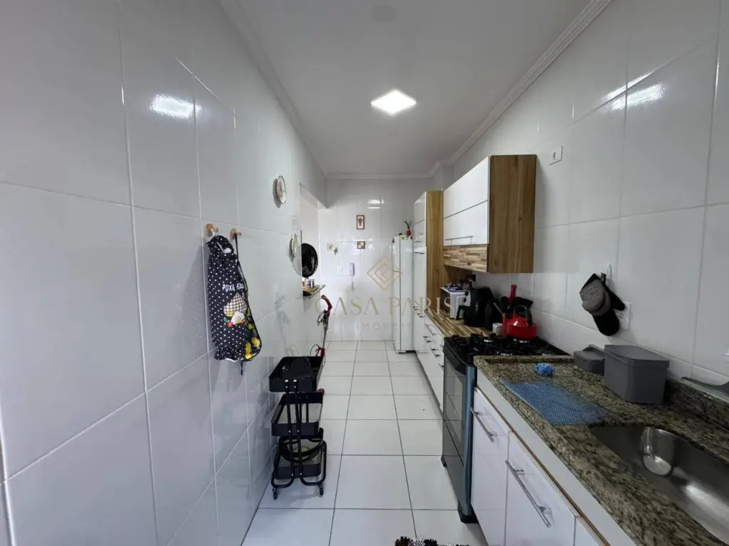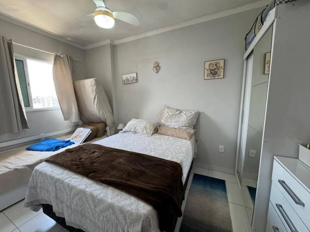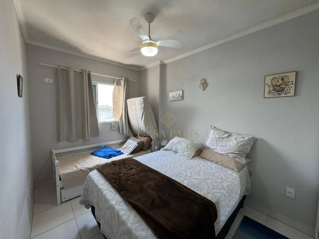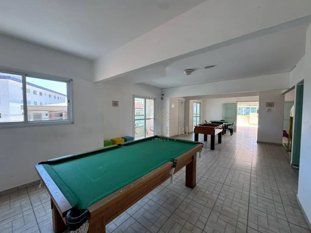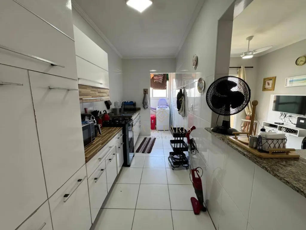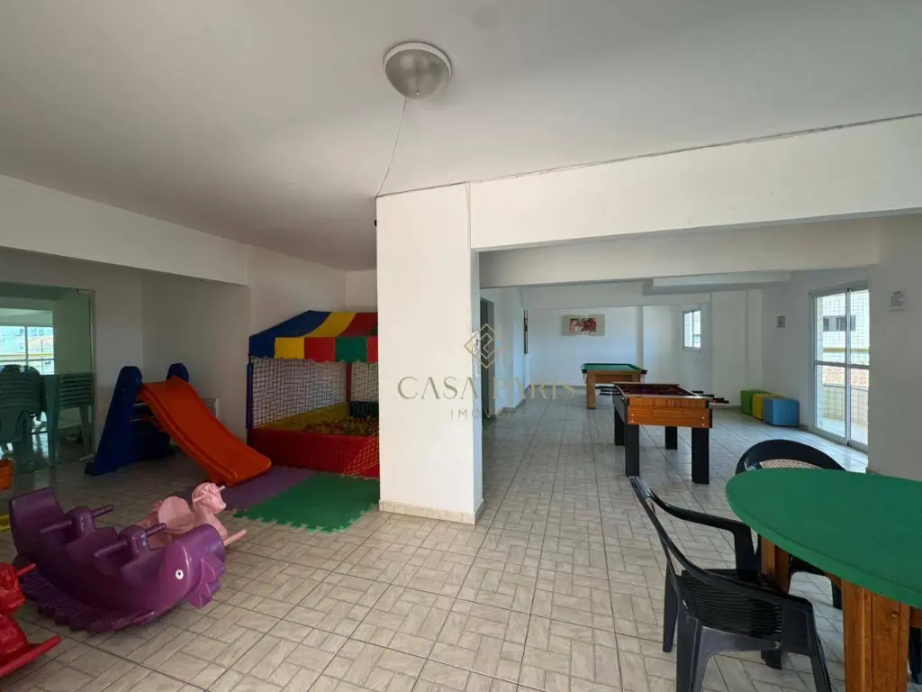 Apartamento com 1 dormitório, sala para dois ambientes, varanda com vista mar, cozinha, banheiro, área de serviço e 1 vaga de garagem.