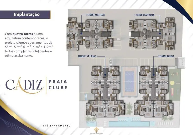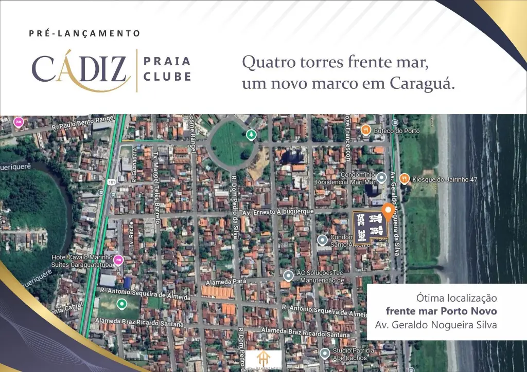 O Cadiz Praia Clube chega para redefinir o conceito de viver de frente para o mar. Localizado no bairro Porto Novo, uma das a´reas que mais se valorizam em Caraguatatuba, o empreendimento nasce como um dos maiores complexos residenciais da regia~o, unindo sofisticac¸a~o, lazer e uma vista simplesmente deslumbrante.