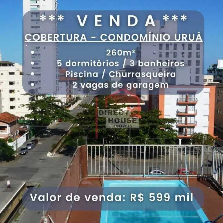 ? Cobertura Duplex na Enseada - Guarujá | Oportunidade ÚNICA por R$ 599 mil Imagine viver ou investir em uma cobertura ampla, iluminada e com área externa completa - churrasqueira, piscina privativa e uma vista aberta para o mar. Agora imagine tudo isso por apenas R$ 599 mil, um valor bem abaixo da média da região, graças à mudança urgente do proprietário para outro estado. Uma chance rara de garantir o imóvel dos sonhos com um valor que dificilmente aparece no Guarujá. ??? Sobre a Cobertura ?? R. Alberto Quatrini Bianchi, 68 - Condomínio Uruá - Enseada, Guarujá ? 260 m² ? Duplex ? Piscina privativa ? Churrasqueira exclusiva ? 5 quartos ? Sala ampla para 3 ambientes ? 3 banheiros ? Cozinha espaçosa ? 2 vagas de garagem ? Excelente área externa ? Vista para o mar ?? Estrutura do Prédio Elevador Portaria eletrônica Sistema de câmeras de segurança Localização privilegiada com infraestrutura completa Documentação 100% em dia, sem pendências ?? Valores Preço especial: R$ 599 mil (BEM abaixo da média da região) Condomínio: R$ 1.755,19 IPTU: Cobertura - R$ 878,84 / Garagem - R$ 45,38 ?? Diferencial que torna essa oferta ainda mais rara Eu tenho EXCLUSIVIDADE na venda desta cobertura. Isso significa: ? Negociação direta, rápida e segura ? Acesso privilegiado a todas as informações ? Oportunidade que não está nas mãos de outros corretores Esta é a típica oportunidade que surge uma vez na vida - e costuma ser agarrada por quem age rápido. Se você sentiu que este imóvel é para você, não ignore isso. Essa mensagem não chegou até você por acaso. ?? Chame agora e garanta sua visita antes que alguém avance na negociação. ?? Contato: Tiago Rabello CRECI 159.740 WhatsApp: (11) 95440-6775