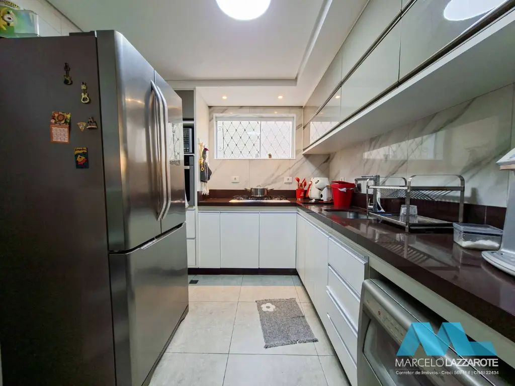Piso inferior: sala ampla para 2 ambientes, home office, sala de jantar, cozinha, lavabo, lavanderia, edícula com 1 suíte, canil, piscina com cascata, churrasqueira e 2 vagas de garagem coberta com portões automáticos.