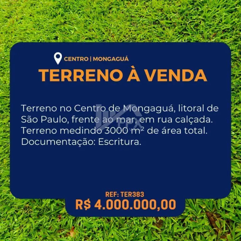 Terreno no Centro de Mongaguá, litoral de São Paulo, frente ao mar, em rua calçada. Terreno medindo 3000 m² de área total.Documentação: Escritura.