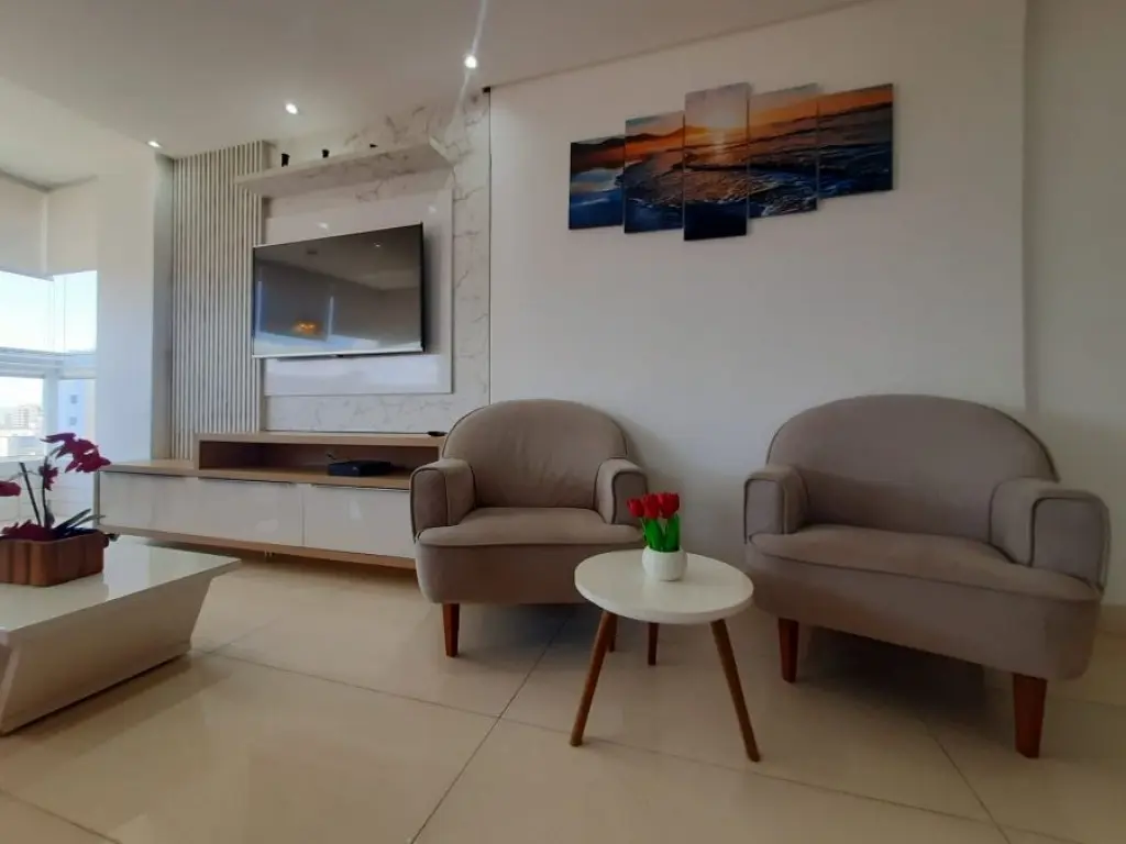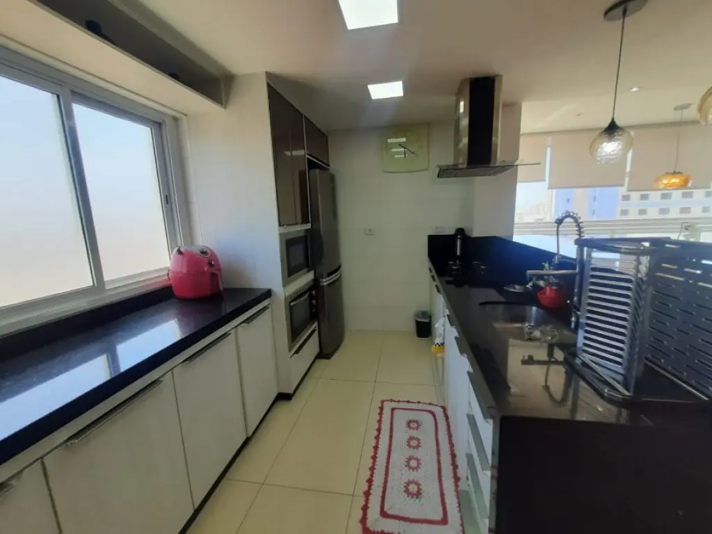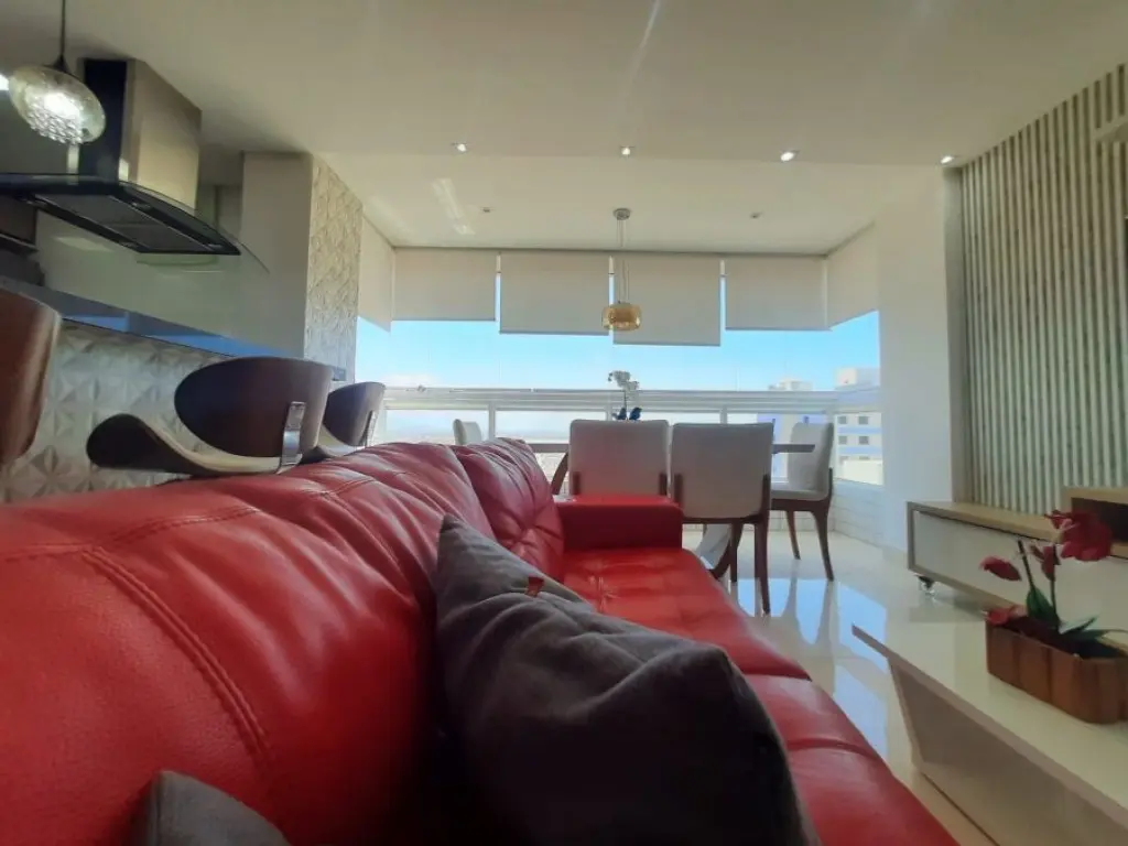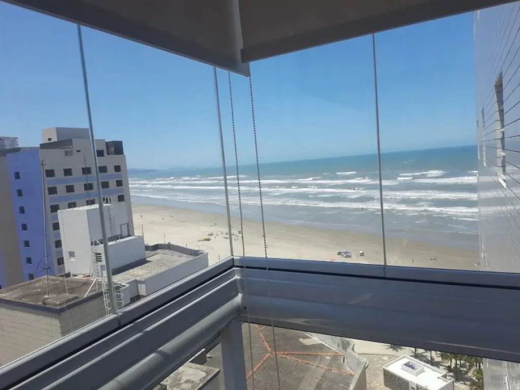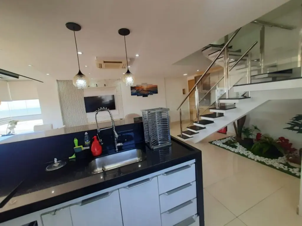 A área gourmet é o grande destaque: totalmente envidraçada, com hidromassagem, churrasqueira a carvão tradicional e uma vista panorâmica para o mar de tirar o fôlego.