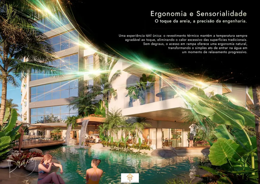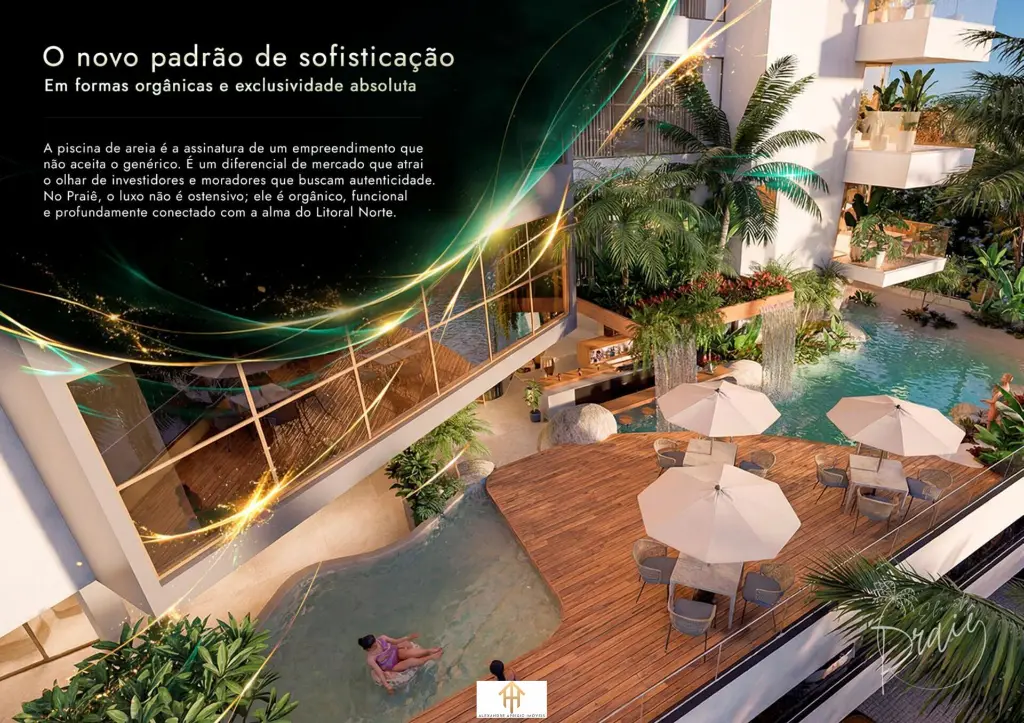 O grande destaque fica por conta da piscina natural, um verdadeiro convite ao relaxamento, que recria a sensação de uma praia privativa dentro do condomínio, com paisagismo integrado e elementos naturais que transformam o dia a dia em uma experiência única.