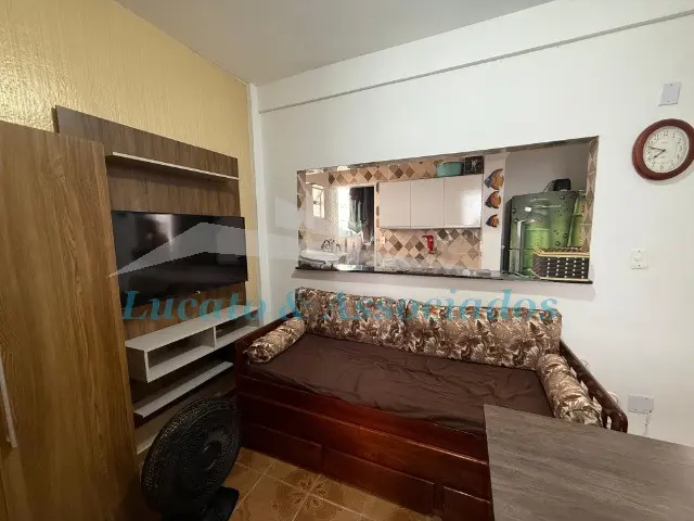 kitnet dividido em dormitório/sala, cozinha e banheiro, com vaga de garagem rotativa.