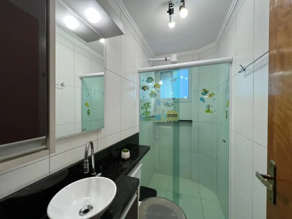 - Banheiro com gabinete planejado e chuveiro instalado