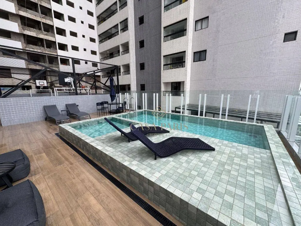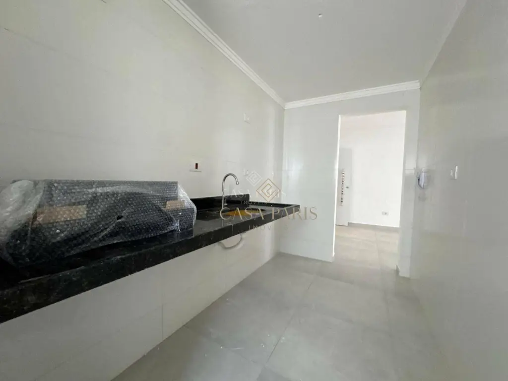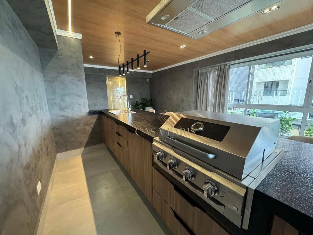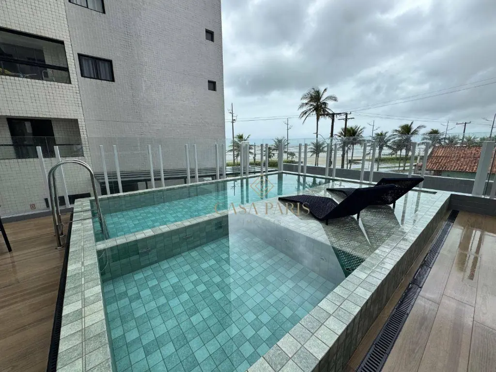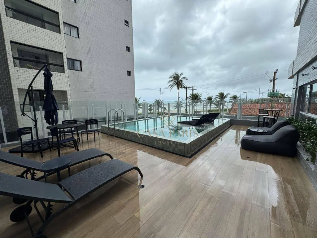 Apartamento com 1 dormitório, varanda gourmet com vista mar, sala 2 ambientes, cozinha, área de serviço, banheiro social e 1 vaga de garagem. Piso porcelanato, forro de gesso na cozinha, banheiro e varanda, churrasqueira à gás, pisos e lavatórios em granito, infraestrutura para ar condicionado.