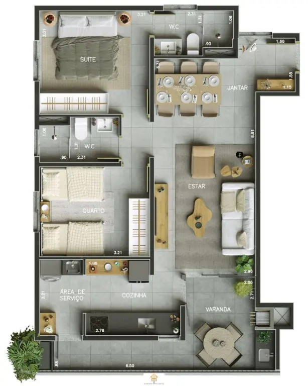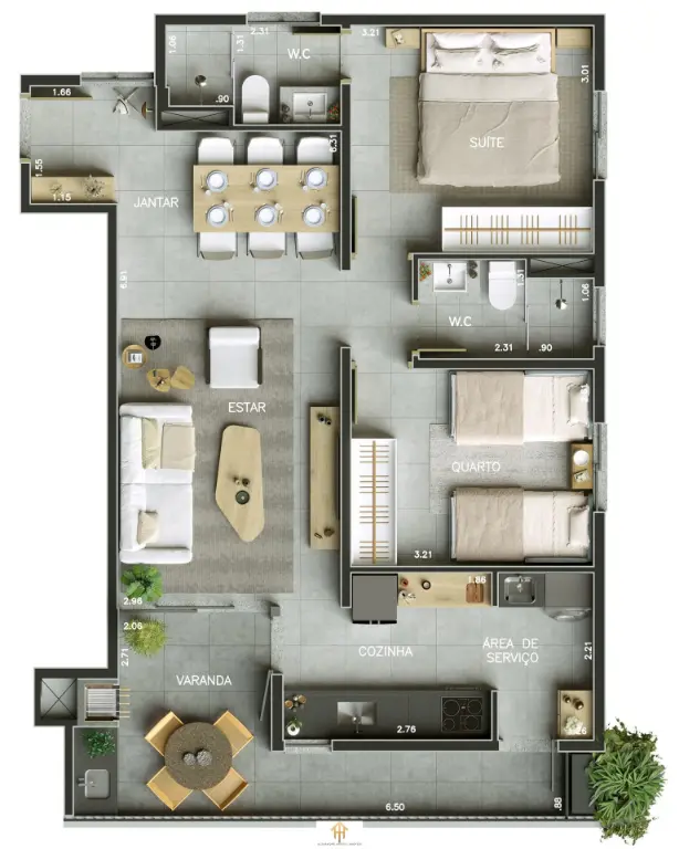 Plantas de 74m² e 80m², com 2 dormitórios (sendo 1 suíte), ambientes bem distribuídos, varanda gourmet e infraestrutura para ar-condicionado. As unidades contam com 1 ou 2 vagas de garagem, atendendo diferentes perfis de uso.