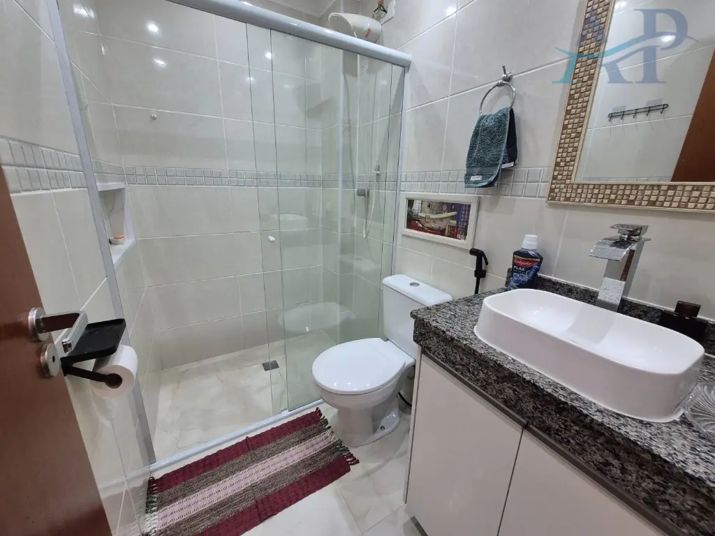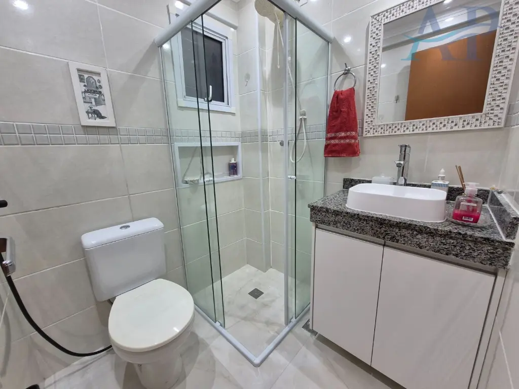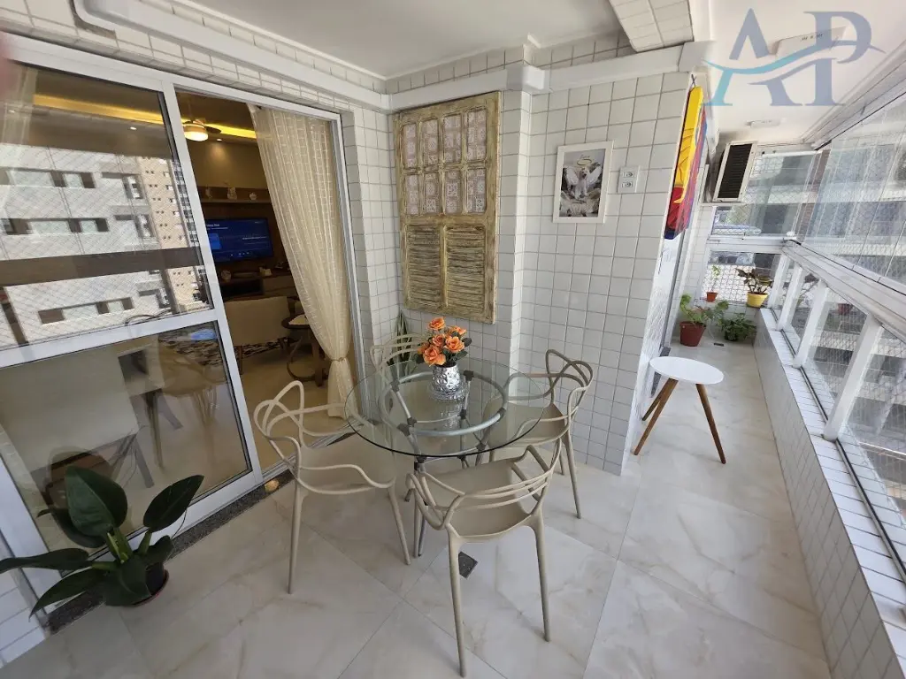 O apartamento possui duas sacadas, de frente e lateral, garantindo iluminac¸a~o natural e agrada´vel. Ampla sala de estar e jantar, com integrac¸a~o para a varanda Gourmet ja´ com fechamento de vidro, proporcionando mais seguranc¸a e aproveitamento de a´rea. Tre^s banheiros no total, com blindex nos boxes, bancadas em granito, cubas em louc¸a e com arma´rios planejados.