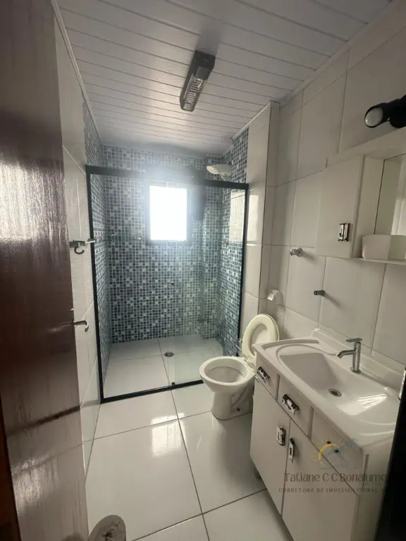 O banheiro possui box de vidro, e o acabamento em piso porcelanato traz sofisticação e fácil manutenção para o dia a dia.