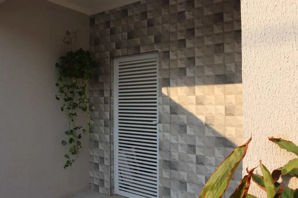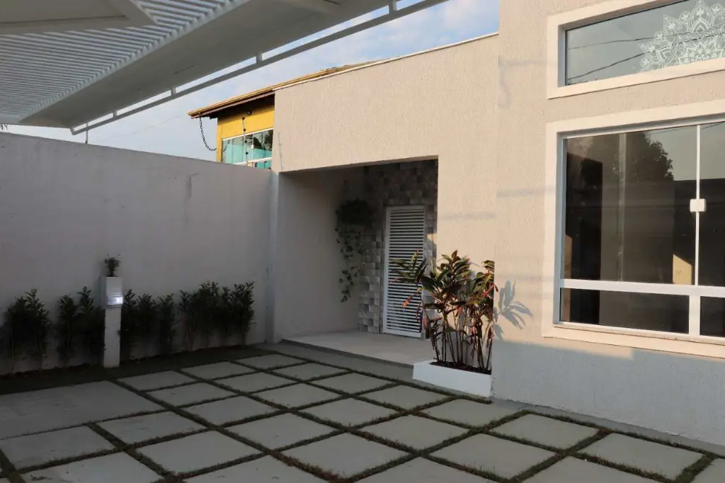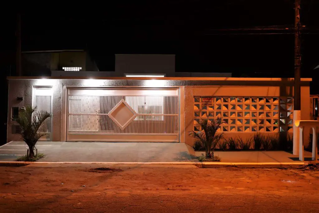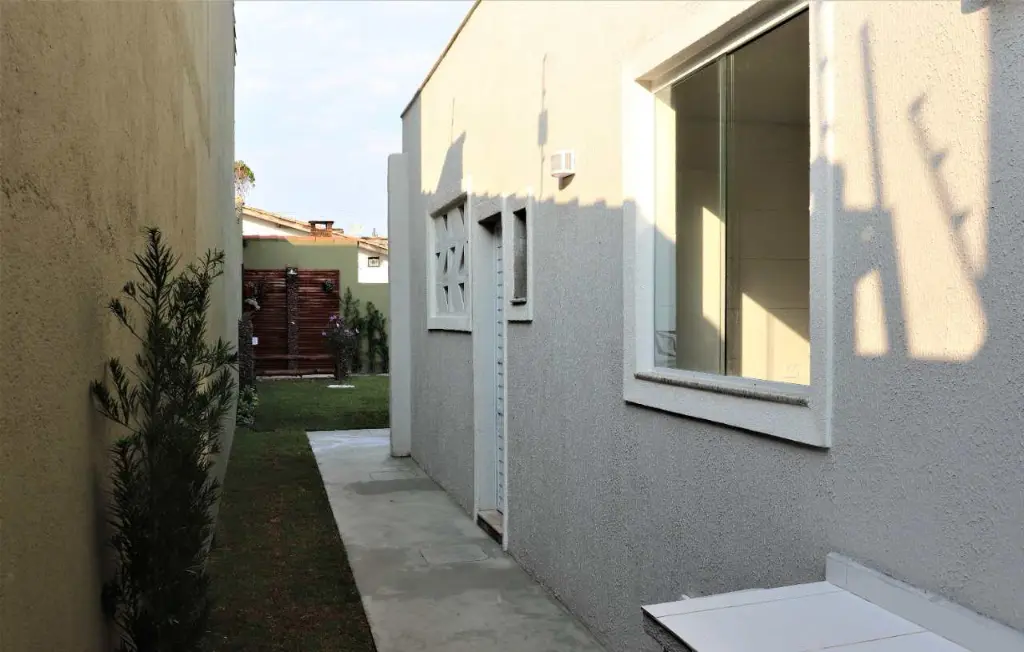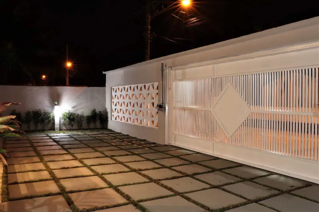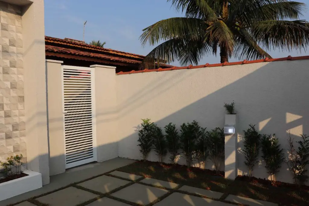 Imóvel robusto, isolado dos dois lados, com corredor de acesso que conecta todos os detalhes, com portões laterais em alumínio branco.