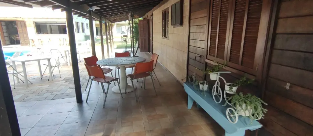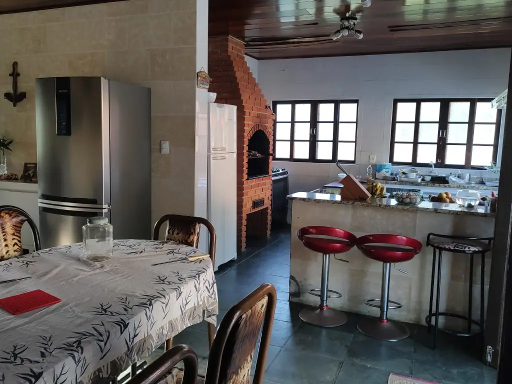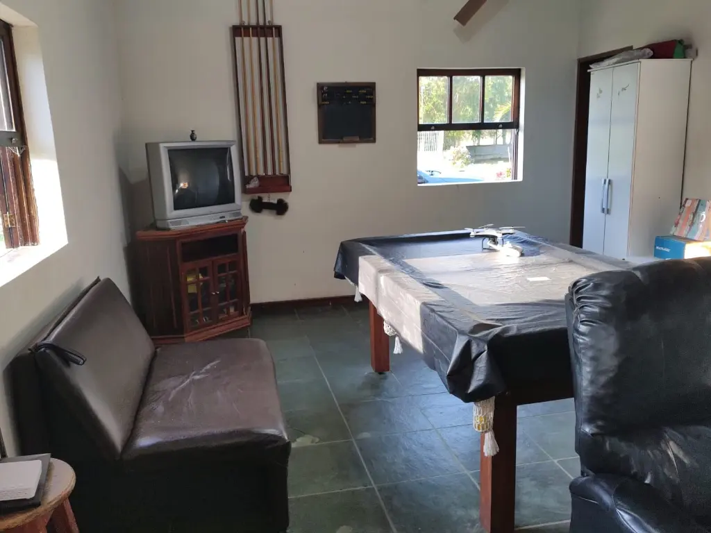1 Salão de festas grande, com mesa de sinuca e sala de TV, cozinha estilo americano com churrasqueira, wc social, varanda com pia e defumador a carvão;