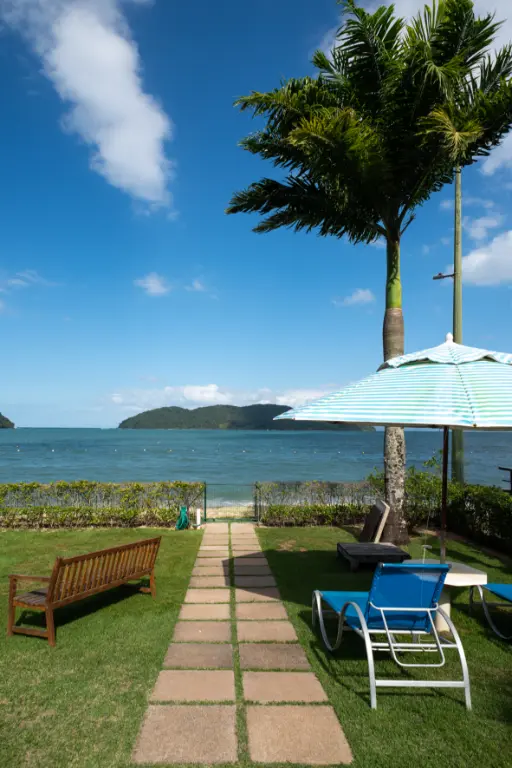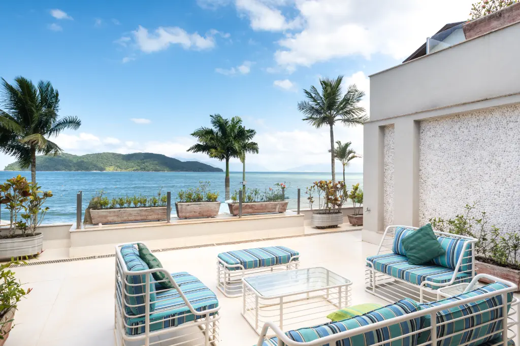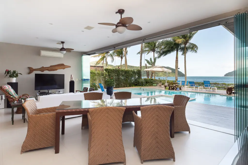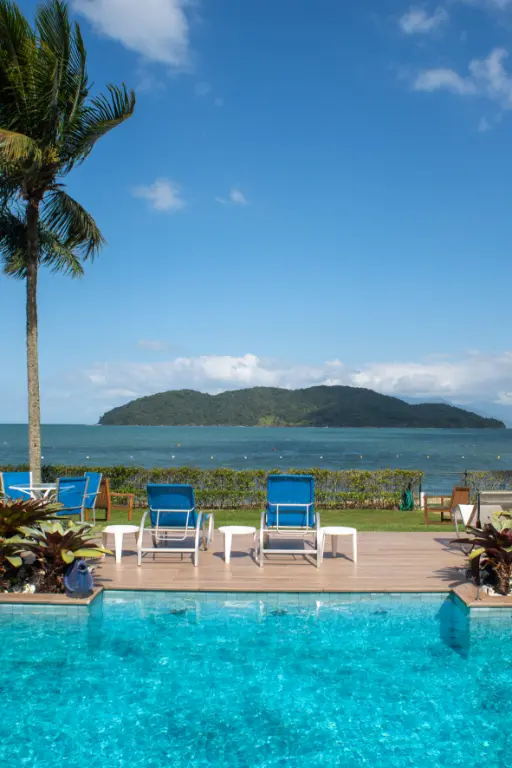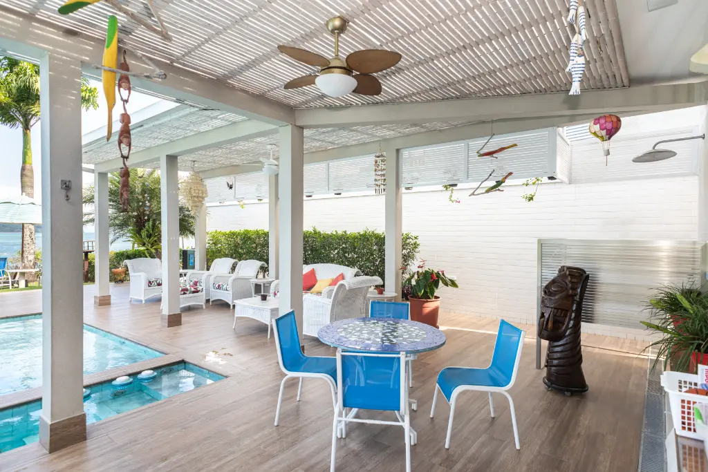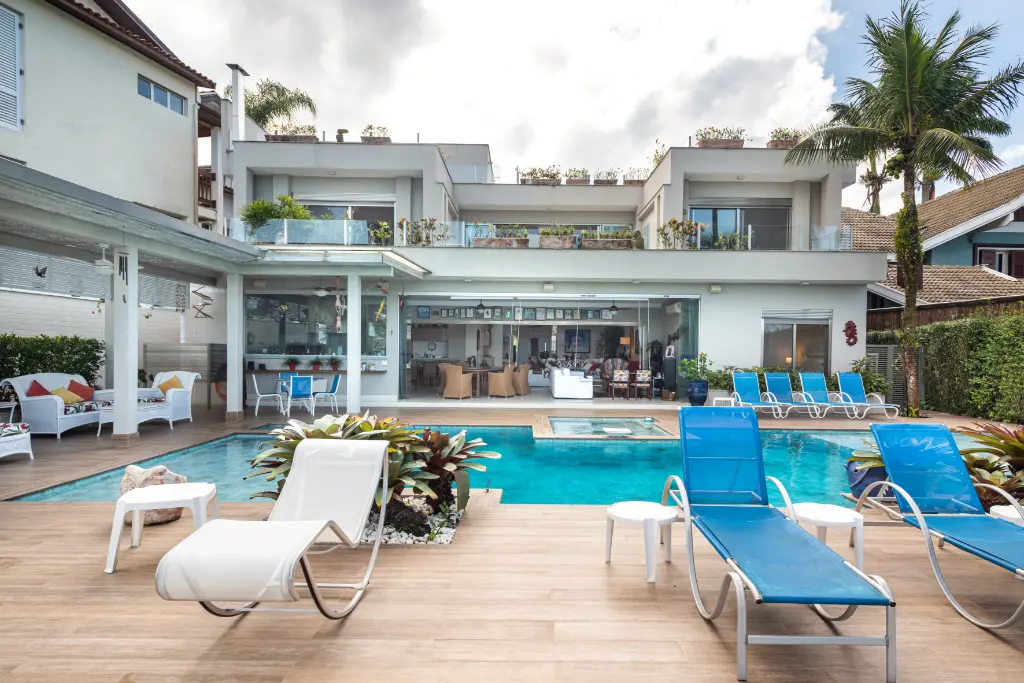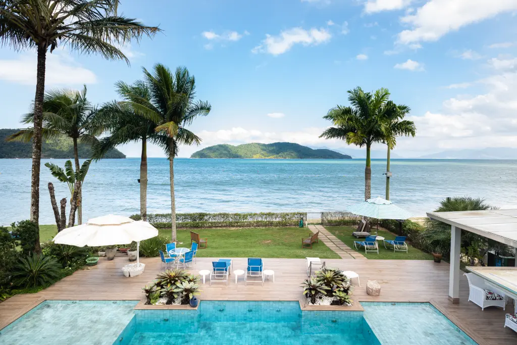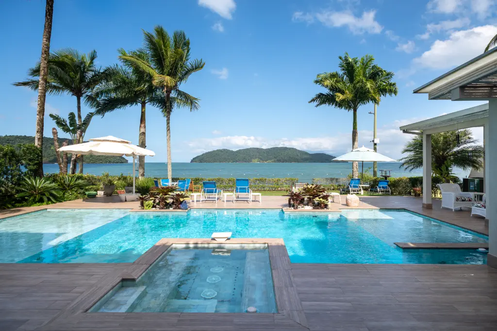 Espetacular área de lazer, com uma ampla piscina e jacuzzi externa, quintal amplo, área gourmet com churrasqueira e mesas para refeição de frente para o mar.