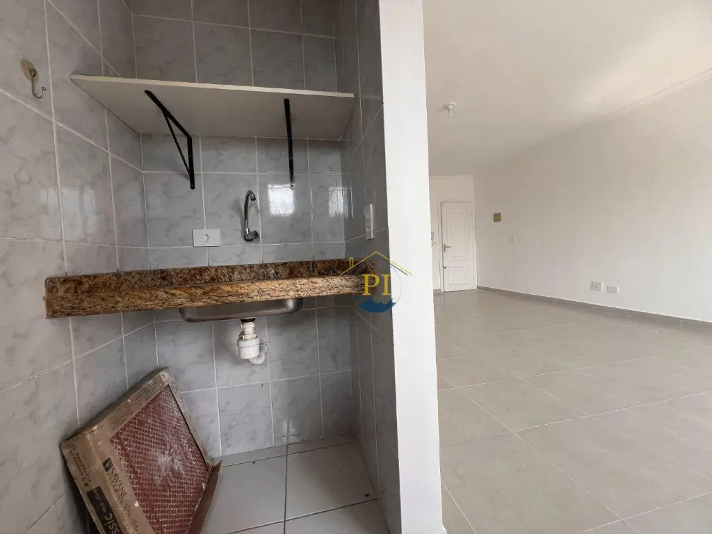Com 47,70 metros de área útil, sala ampla, banheiro, pequeno espaço com pia para cozinha.