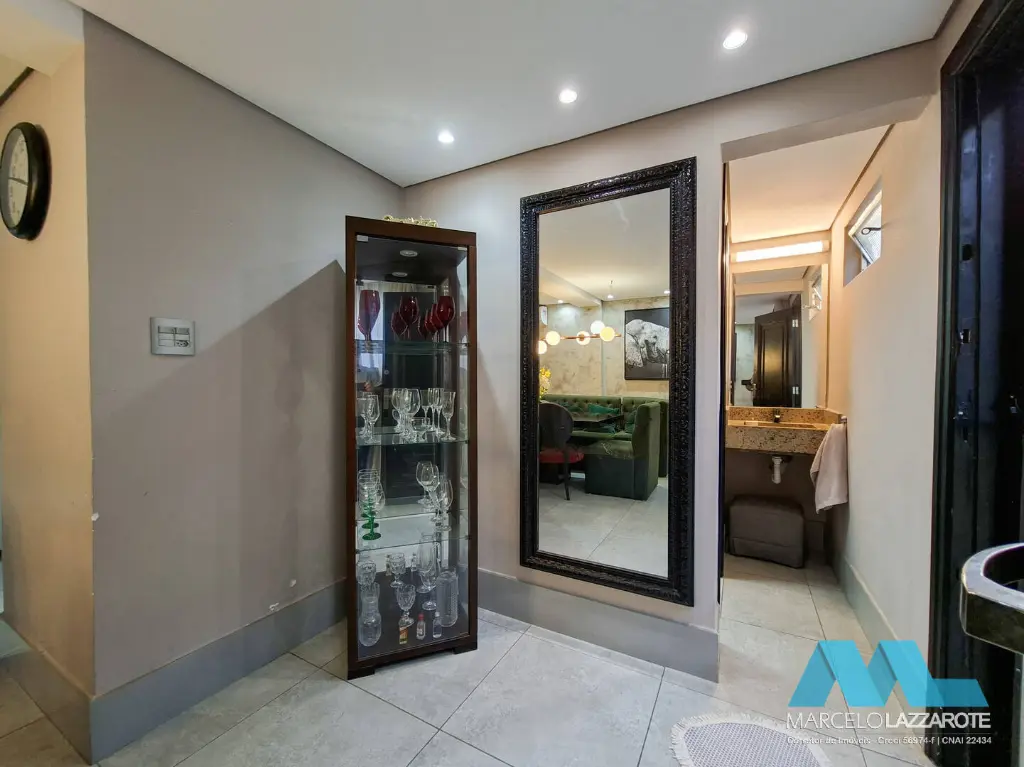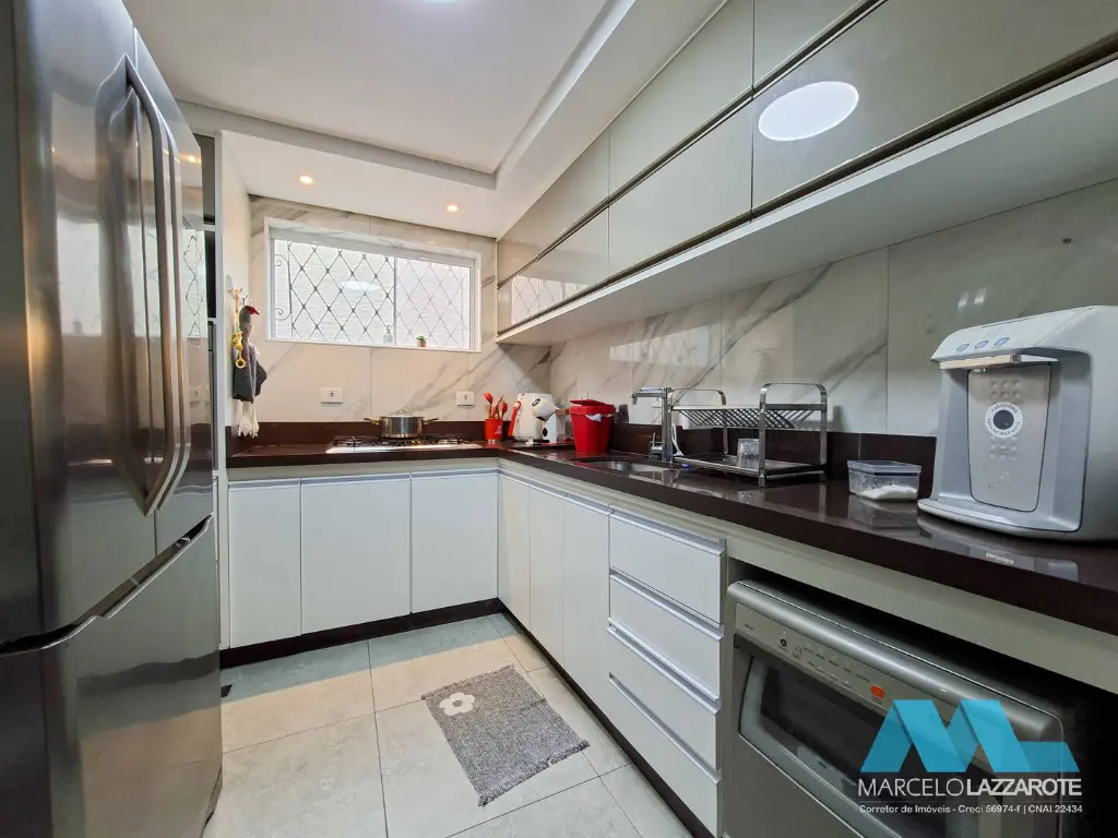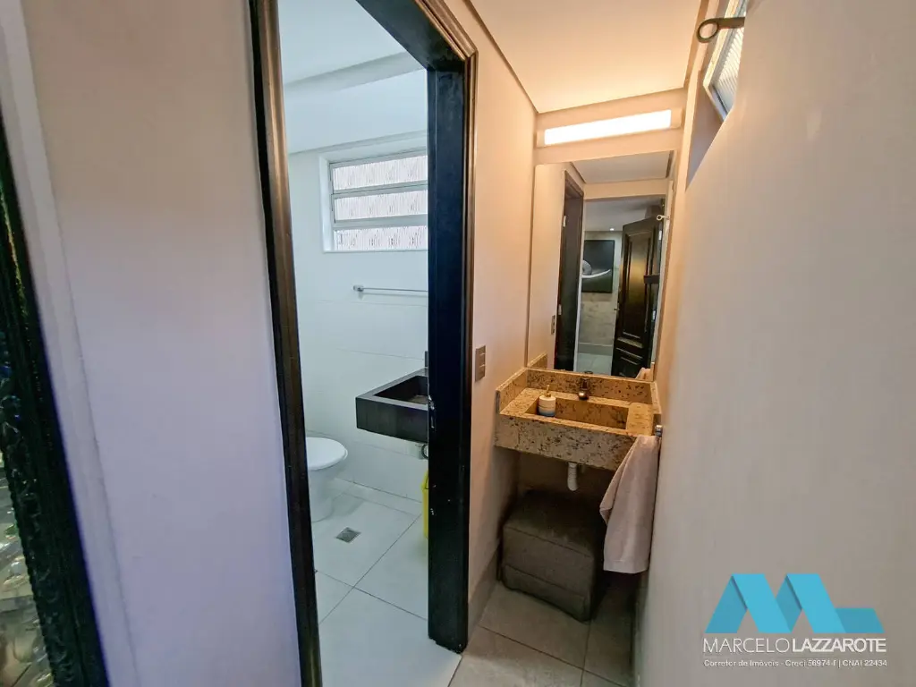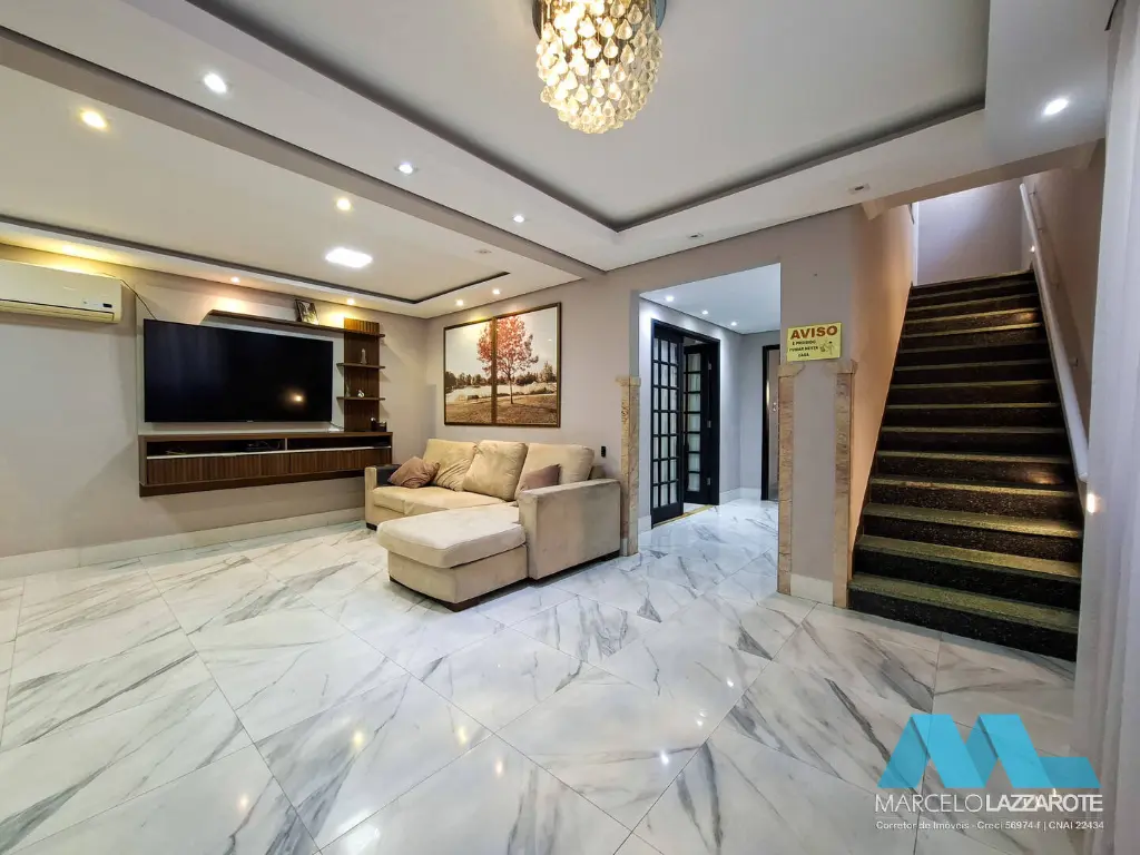 Piso inferior: sala ampla para 2 ambientes, home office, sala de jantar, cozinha, lavabo, lavanderia, edícula com 1 suíte, canil, piscina com cascata, churrasqueira e 2 vagas de garagem coberta com portões automáticos.
