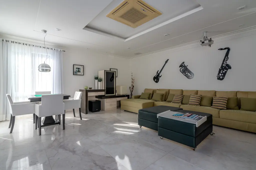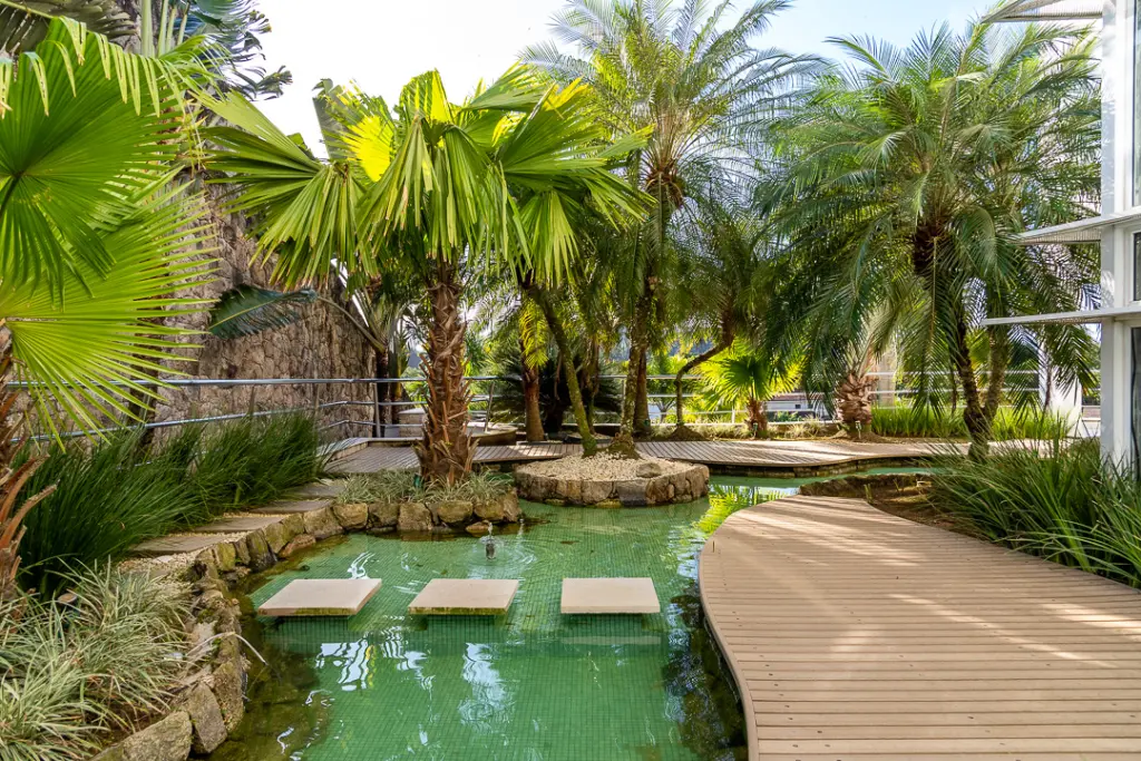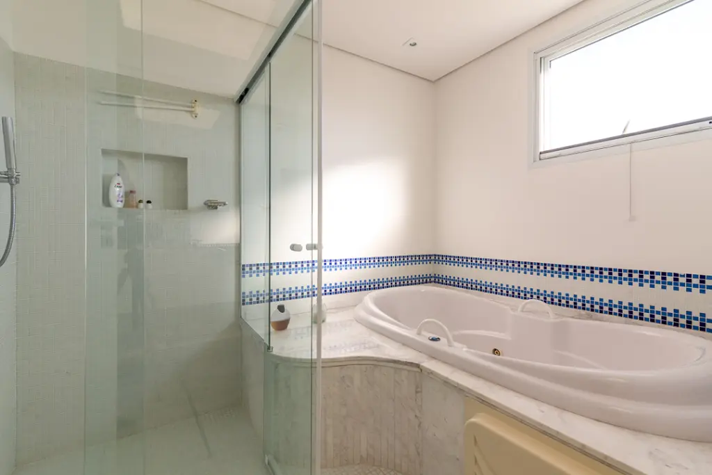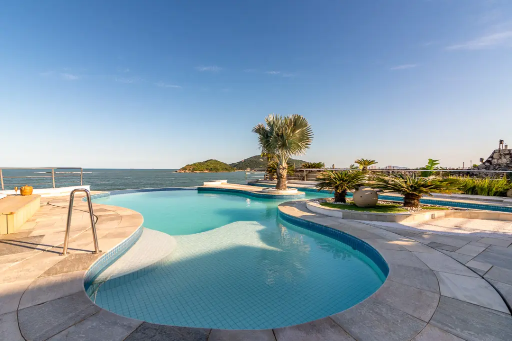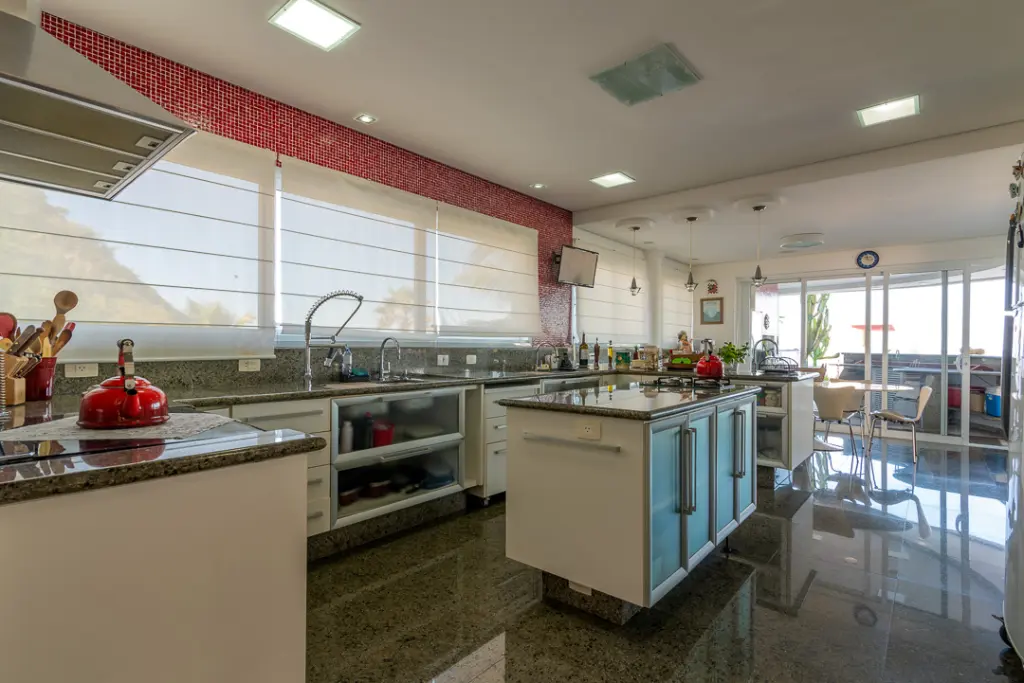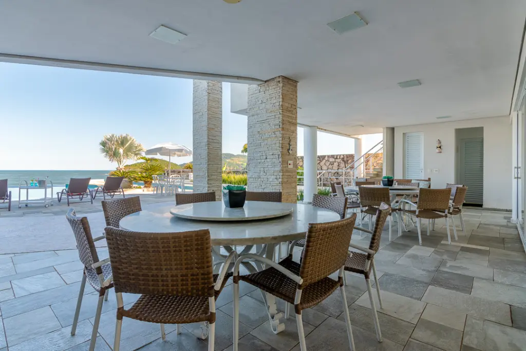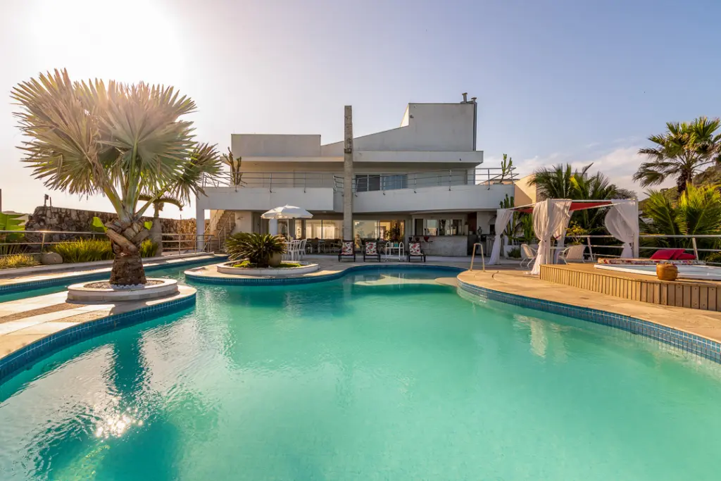 Sala com mais de 100m2 que com forma harmoniosa delimita os quatro amplos ambientes internos, arejados, totalmente envidraçados e voltados para área da piscina e hidro, desfrutando de exuberante vista, dois lavabos, escritório e extenso home theater e ofurô.